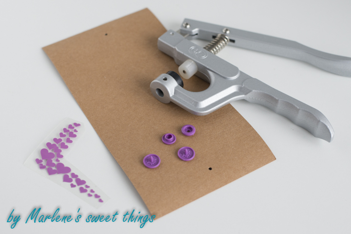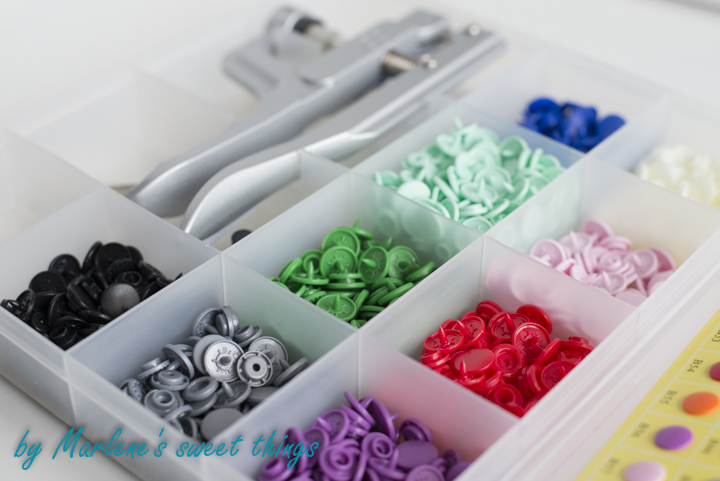 Nach der Dekoration werden die KAMSnaps angebracht. Man braucht jeweils ein Stud, ein Socket und zwei Caps. Wo ihr welchen anbringt spielt keine Rolle. Anstelle von KAMSnaps könnt ihr auch einen Druckknopf annähen.