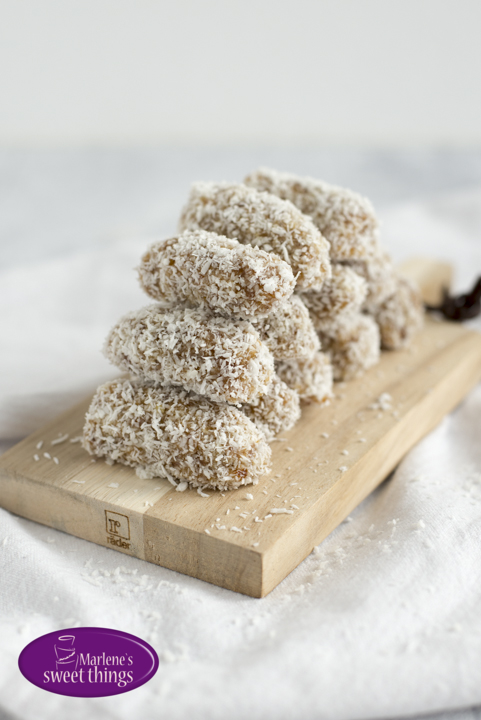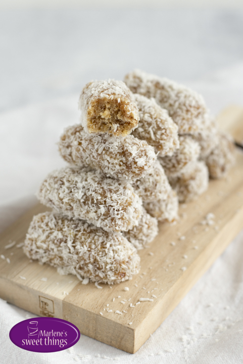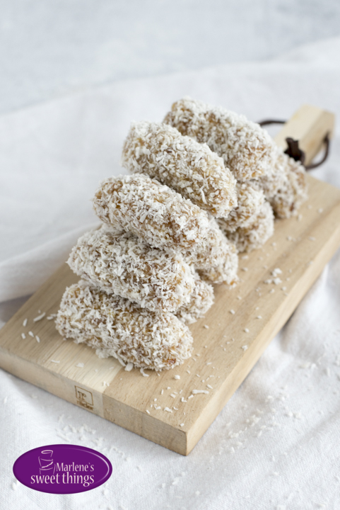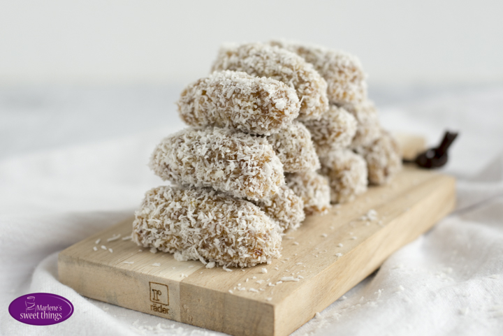 Alle Zutaten ausser Kokosraspeln in die Food Prozessor* geben und mixen, bis eine homogene feste Masse entsteht. Teig zu circa 24 Rollen formen und in den Kokosraspeln rollen.