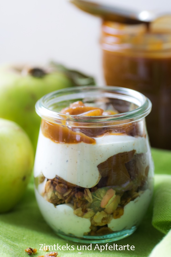 Nachdem alles abgekühlt ist, die Zutaten schichtweise in ein Dessertglas geben. Dabei mit dem Crunch anfangen. Zuletzt noch ein paar Äpfel obenauf und diese mit Karamellsauce beträufeln.
