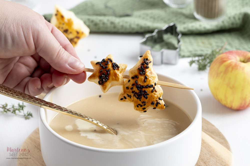 - In der Zwischenzeit Sterne und Tannen aus Blätterteig stechen, mit Eigelb bestreichen und mit Schwarzen Sesam bestreuen. Für 20 Minuten bei 200° Ober- und Unterhitze backen.