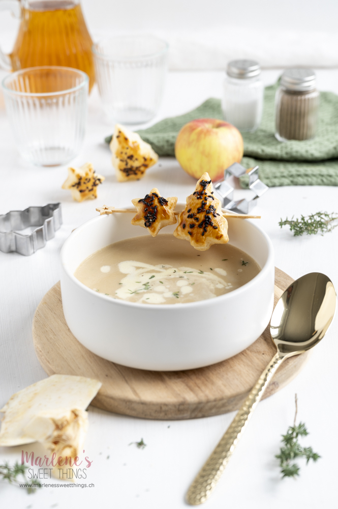 Stressfreie Weihnachten sind mir Heilig, auch wenn ich Gäste habe. Das heisst aber nicht, dass ich mir keinen Aufwand mache. Stressfrei heisst für mich, ein Menü zu planen, so dass ich viel Zeit mit meinen Gästen verbringen kann und vieles vorbereiten kann. Zur Vorspeise plane ich meistens eine Suppe, da es zur Jahreszeit sehr gut passt. Die cremige Selleriesuppe mit Apfel kann man auch bereits anfangs Dezember kochen und einfrieren, denn es merkt niemand, ob sie Frisch gekocht ist oder bloss nochmals erwärmt ist. Den man schmeckt nur die guten Zutaten, wo mit viele Liebe zu einer Suppe gekocht wurden.