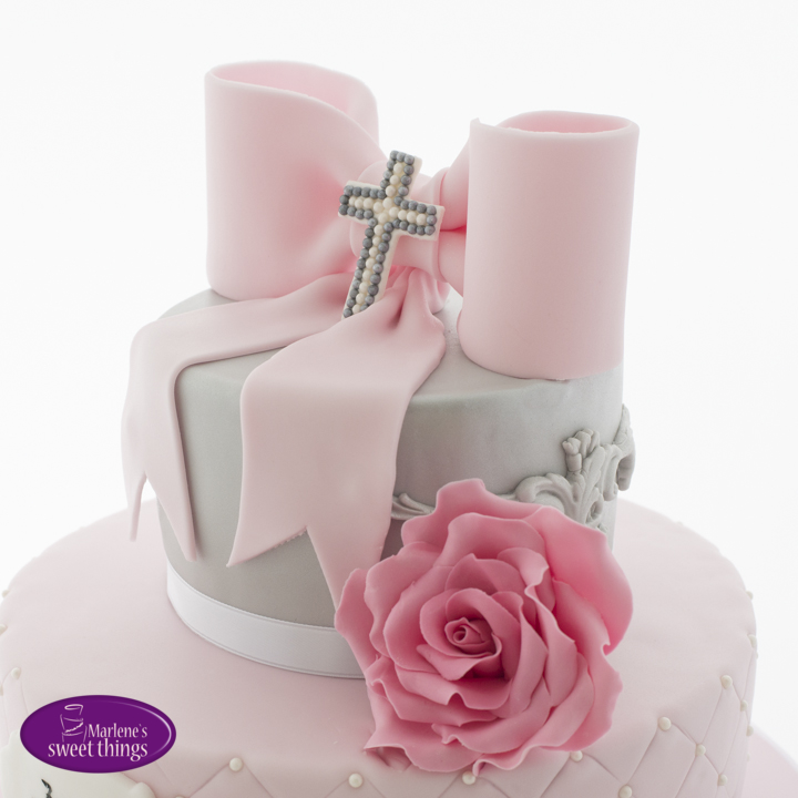 Die Tochter meiner Freundin wurde gefirmt und hatte ganz klare Vorstellungen wie IHRE Torte sein muss, denn sie macht selbst auch Motivtorten. Ich finde es so genial, dass sie so begeistert ist vom Backen und Dekorieren. Sie zeigte mir mehrere Fotos von Torten und erklärte mir was von welcher Torte gefällt und so kam ihre Torte zu Stande. Rosa und ein Zartes Grau soll es, denn die Farben wurden passend zu ihrem Kleid und der Tischdeko gewählt. Letzteres hat sie auch selber gemacht. Hach wie schön gibt es noch so Junge Menschen mit solchen Interessen.