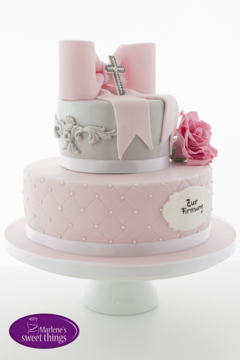 Die Tochter meiner Freundin wurde gefirmt und hatte ganz klare Vorstellungen wie IHRE Torte sein muss, denn sie macht selbst auch Motivtorten. Ich finde es so genial, dass sie so begeistert ist vom Backen und Dekorieren. Sie zeigte mir mehrere Fotos von Torten und erklärte mir was von welcher Torte gefällt und so kam ihre Torte zu Stande. Rosa und ein Zartes Grau soll es, denn die Farben wurden passend zu ihrem Kleid und der Tischdeko gewählt. Letzteres hat sie auch selber gemacht. Hach wie schön gibt es noch so Junge Menschen mit solchen Interessen.