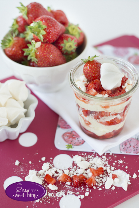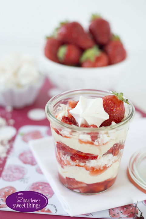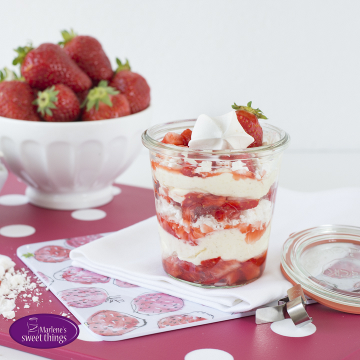 Erdbeeren waschen und in kleine Würfeln schneiden. Mit etwas Zucker und 1 El Zitronensaft marinieren und etwas ziehen lassen. Mascarpone mit dem Schwingbesen glatrühren, restlichen Zucker, Zitronensaft und Vanillepaste hinzu geben und vermischen. Rahm steifschlagen. Rahm unter die Mascarpone heben. Meringues grob zerdrücken. Mascarponecreme, Erdbeeren und Meringues Schicht weise in die Einmachgläser verteilen. Vor dem Servieren mindestens 1 Stunde in den Kühlschrank stellen.