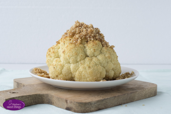 Also kaufte ich ein kleinen Blumenkohl, eins meiner lieblings Gemüsesorte seit meiner Kindheit, und schob ihn in den Ofen. Ich dachte schon an Plan B wenn es imfall nix wird, gäbe es eine Blumenkohl-Suppe. Nach einer Stunde war es nun geschehen und Plan B brauchte ich definitiv nicht. Schnell machte ich mir noch eine kleine Panade für obendrauf und zack war mein gerösteter Blumenkohl aus dem Ofen auf dem Tisch. Ich finde es genial, gerade wenn man einen programier fähigen Backofen hat, kann man alles bereits am Morgen oder sogar am Abend davor vorbereiten, in den Ofen geben und programmieren für den nächsten Tag. Fertig. Perfekt oder?