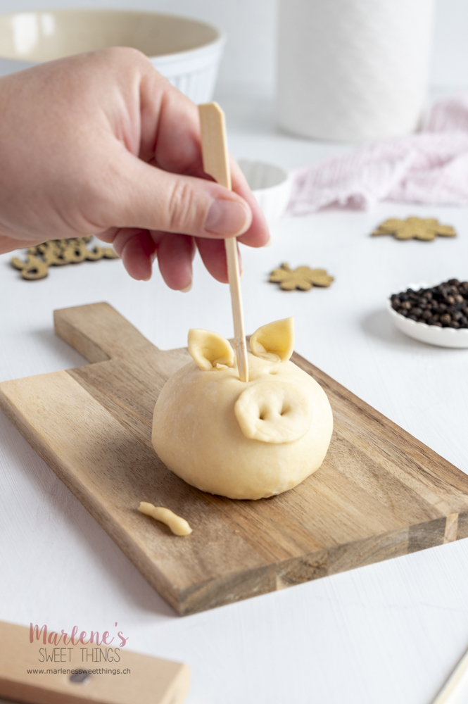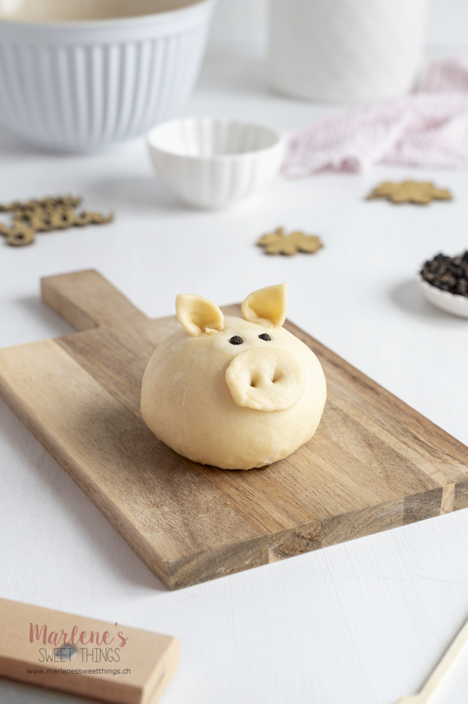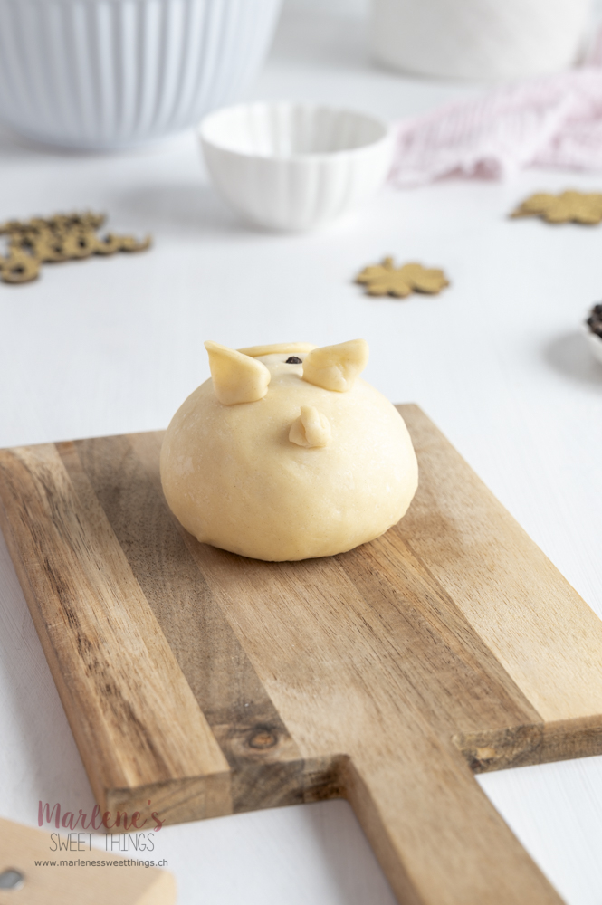 - Eigelb mit Kaffeerahm mischen. Anschliessend die Glückschweinchen damit bestreichen. Für circa 21 Minuten backen. Herausnehmen und abkühlen lassen.