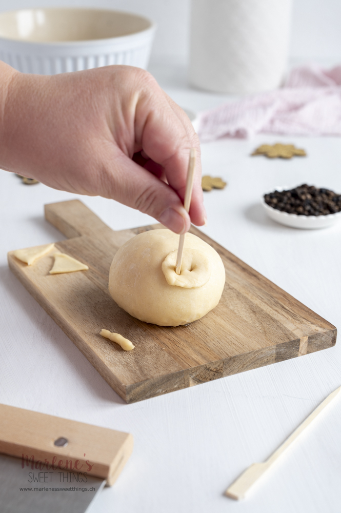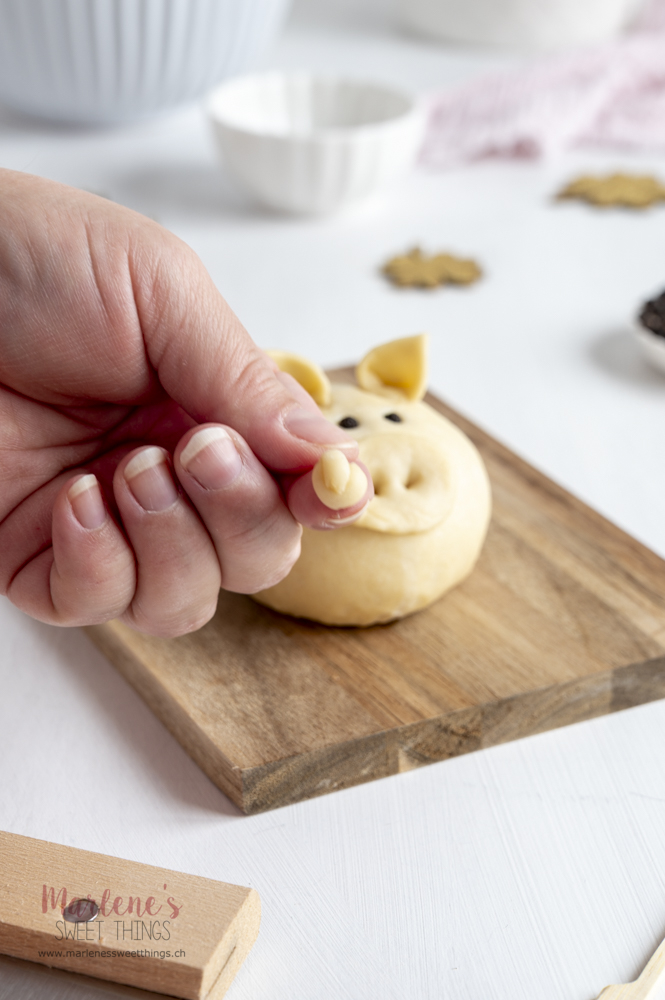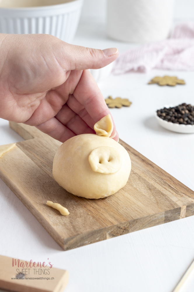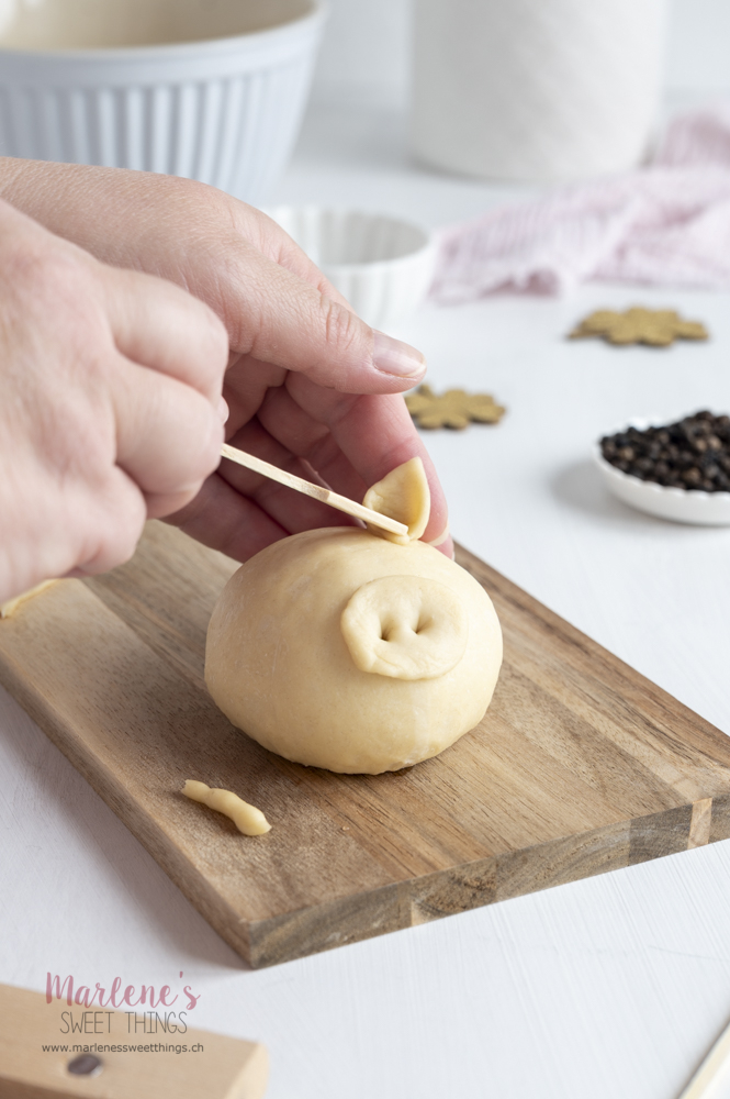 - Auf die Teiglinge etwas Wasser bepinseln, wo Nase, Ohren und Schwänzchen platziert werden. Alles platzieren und vorsichtig andrücken.
