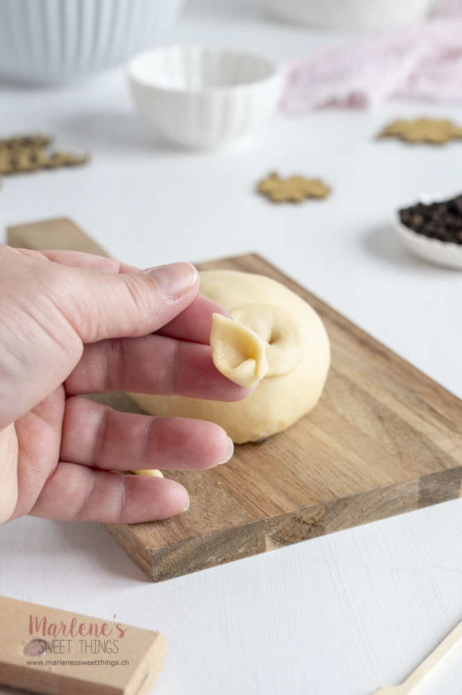 - Teig in 100g Stücke abwiegen und zu Kugeln schleifen und auf ein Backpapier belegtes Backblech geben. Im Kühlschrank kaltstellen.
