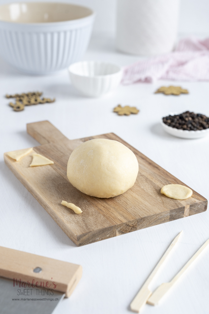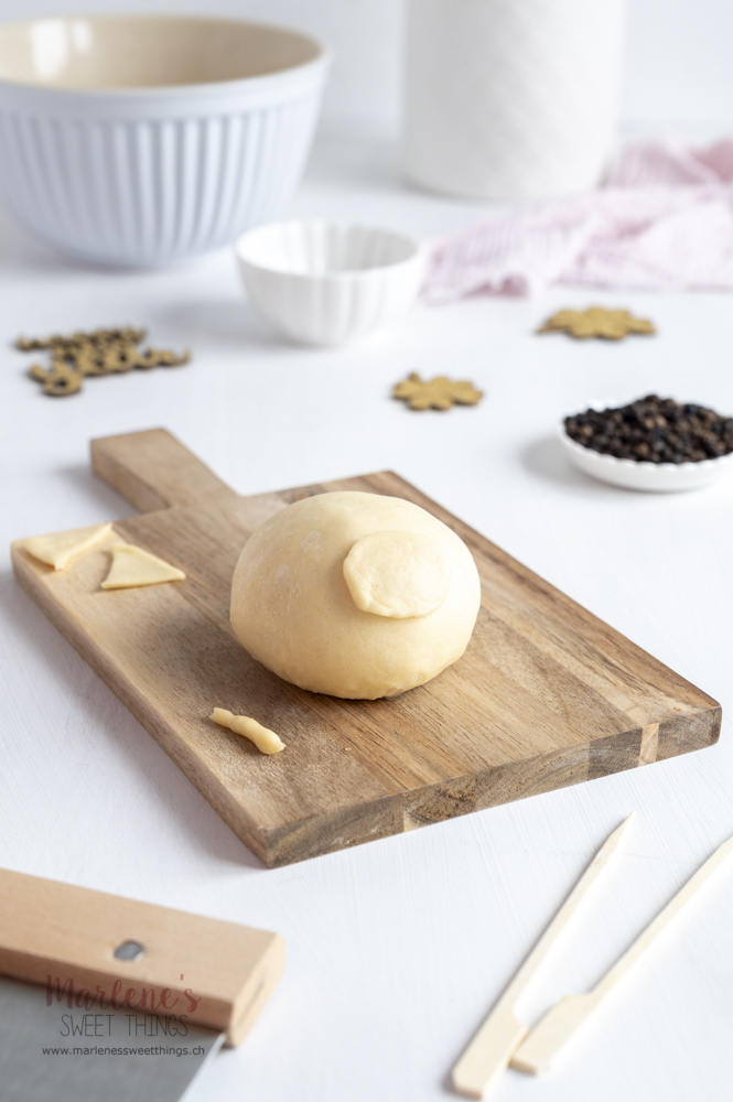 - Restlichen Teig 3mm dünn ausrollen, wenn nötig etwas Mehl verwenden. Teig ablösen und anschliessend 2 Minuten ruhen lassen zum Entspannen. Teig nochmals auf 3mm ausrollen. Mit einem runden Ausstecher (3cm) oder mit einer Spritztülle 8 Kreise ausstechen für die Schweinchen Nase. Einen 2cm breiten Streifenschneiden aus dem ausgerollten Teig. Daraus 16 Dreiecke schneiden und zu Ohren falten. Anschliessen noch 8 kleine Ringelschwänzchen formen.