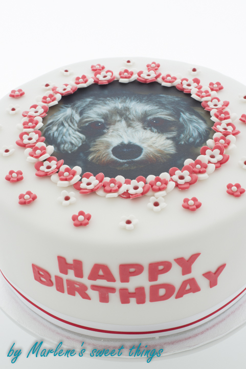 Happy Birthday liebes Frauchen. Dieses schlichte Torte durfte ich bereits letztes Jahr machen und der Hund des Geburtstagkind durfte dabei die Hauptrolle spielen. Ist es nicht süss wie der Hund aus der Torte guckt? Solche Essbaren Fotos könnt ihr bei mir bestellen. Unter der Fondantdecke verbringt sich ein Biskuit mit Himbeer Quarkfüllung.
