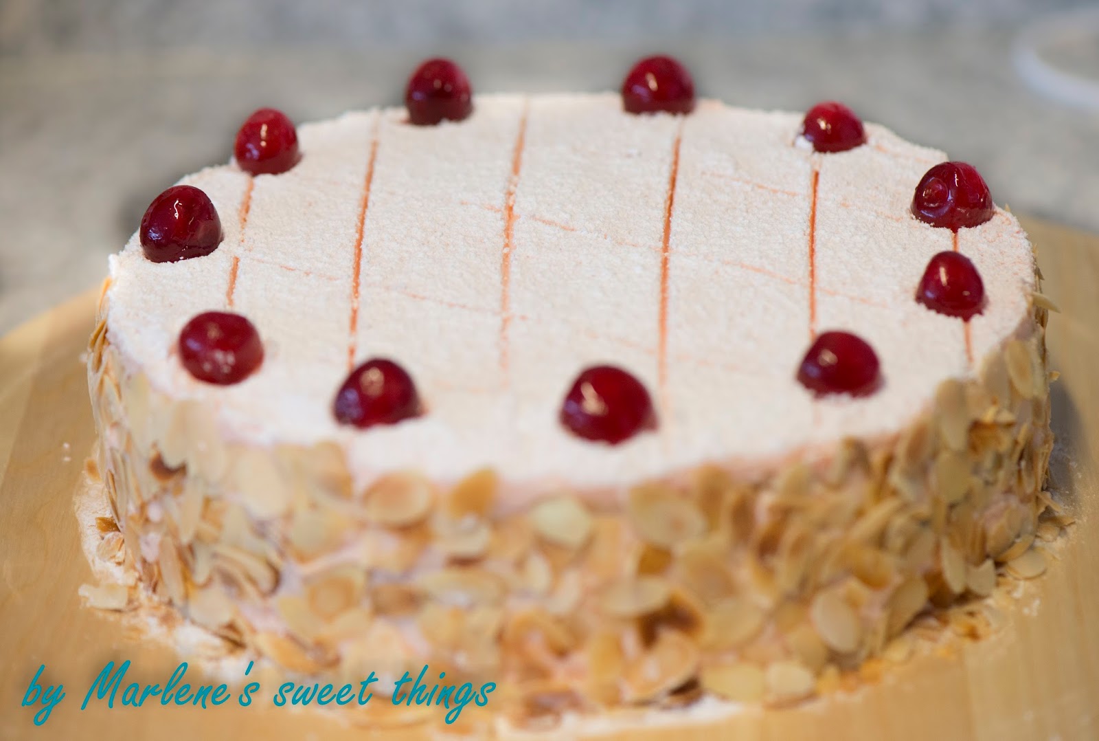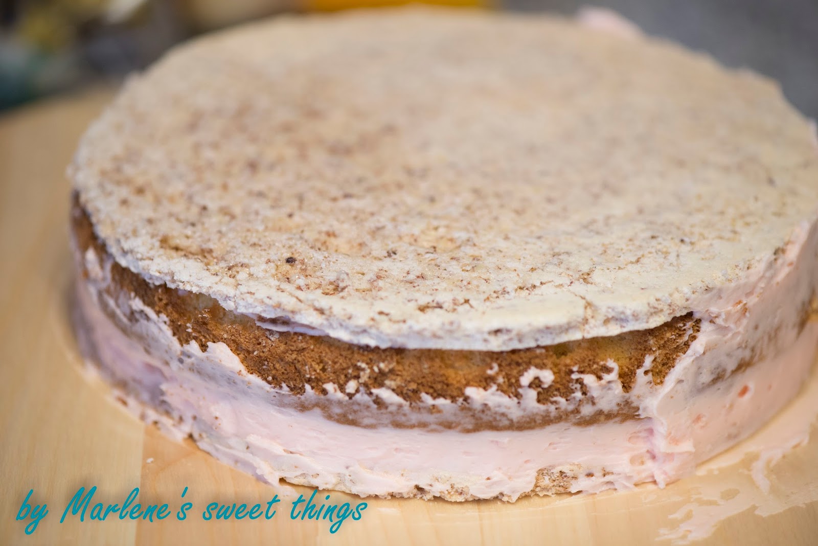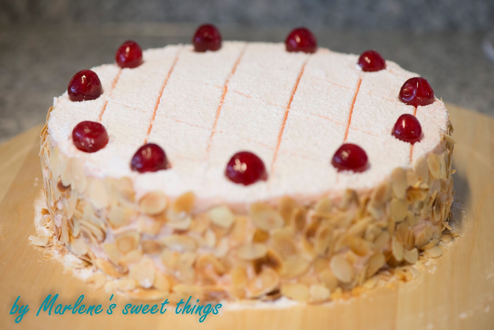 Ich muss gestehen, diese Torte kannte ich noch gar nicht! Aber sie kommt definitiv auf meine Nachback-Liste, Kirsch, Creme und Baiser muss ja gut sein 🙂