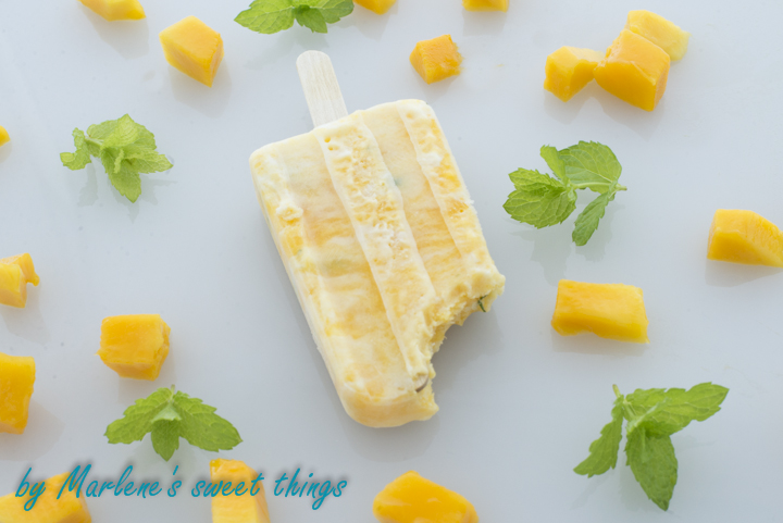 Bei der lieben Miss Blueberrymuffin hatte ich diese wundervollen Nutella-Eis am Stiel gesehen und habe mich so in die Form verliebt. Ich musste sie einfach haben. Leider hatte ich sie schon lange bestellt, aber der Onlineshop hat nie geliefert und nun konnte ich endlich die Form ausprobieren und da ich eine zuckersüsse, reife Mango zu Hause hatte, gibt es heute für euch ein Mango-Minze Joghurt-Eis am Stiel..
