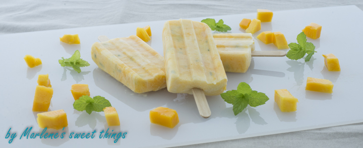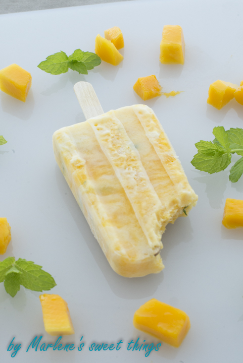 Bei der lieben Miss Blueberrymuffin hatte ich diese wundervollen Nutella-Eis am Stiel gesehen und habe mich so in die Form verliebt. Ich musste sie einfach haben. Leider hatte ich sie schon lange bestellt, aber der Onlineshop hat nie geliefert und nun konnte ich endlich die Form ausprobieren und da ich eine zuckersüsse, reife Mango zu Hause hatte, gibt es heute für euch ein Mango-Minze Joghurt-Eis am Stiel..