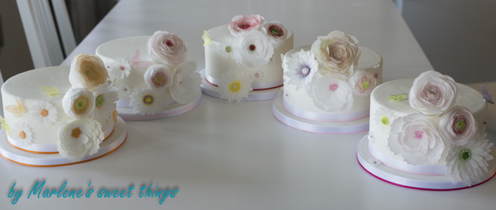 Am Mittag legten wir die Pinsel nieder und widmeten uns dem Trendmaterial „Waferpaper“ (Esspapier). Wir steigerten uns von den einfachen Blumen und Schmetterlingen hinauf zu Ranunkel und Rose. Fleissig wurde diskutiert, als wir jeden Tag mit einander am Tisch sitzen würden uns schon Jahre kennen würden. Dabei durfte auch nie ein Scherz fehlen oder die Begutachtung von den Blumen der Nachbarn. Immer wieder fällt die Frage ist das eine Ranunkel? Ist das eine Rose? Schlussendlich fanden wir heraus, dass jeder eine Rose oder Ranunkel erstellt hat, eventuell einfach eine neue Unterart.