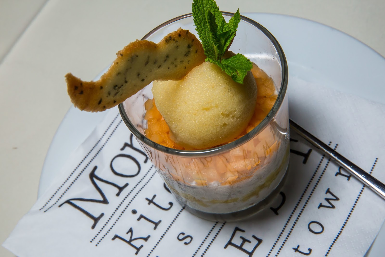 | Nachspeise in Kondensmilch gekochter Wildreis mit Ananas und Mango, Passionsfruchtsorbet und Rosmarin Sables |