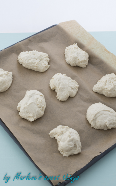 Den Teig aus dem Kühlschrank nehmen,mit einem Esslöffel 8-10 Teigstücke abstechen und auf das Blech legen und für 20 Minuten backen.