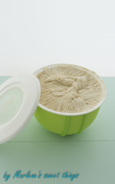 Hefe und Zucker in lauwarmen Wasser in der Rührschüssel auflösen. Salz und Mehl dazugeben und mit den Knethaken zu einem Teig verkneten. Deckel lose oder Küchentuch drauflegen und über Nacht in den Kühlschrank geben.