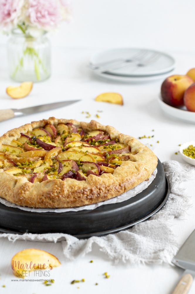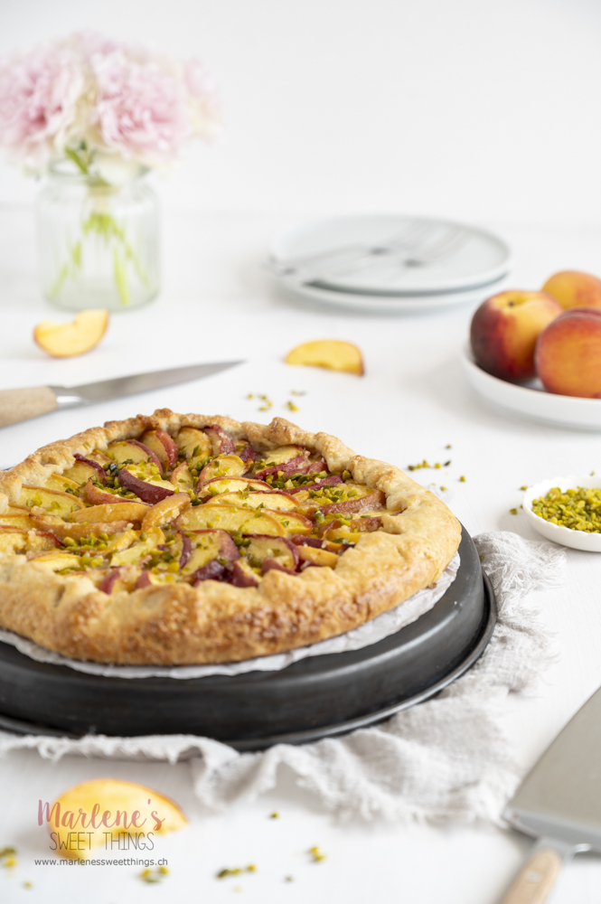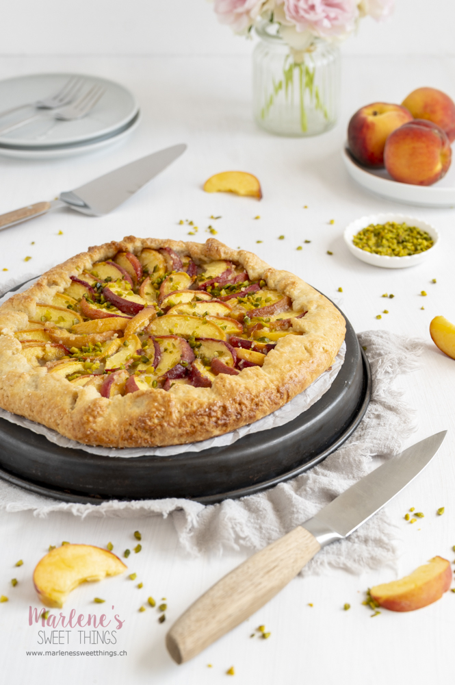 - Für 40-45 Minuten backen. Aus dem Ofen nehmen und mit gehackten Pistazien bestreuen. Pfirsich Galette und warm oder abgekühlt servieren. Wer möchte kann sie mit geschlagenem Rahm, Vanille Glace oder Creme double servieren