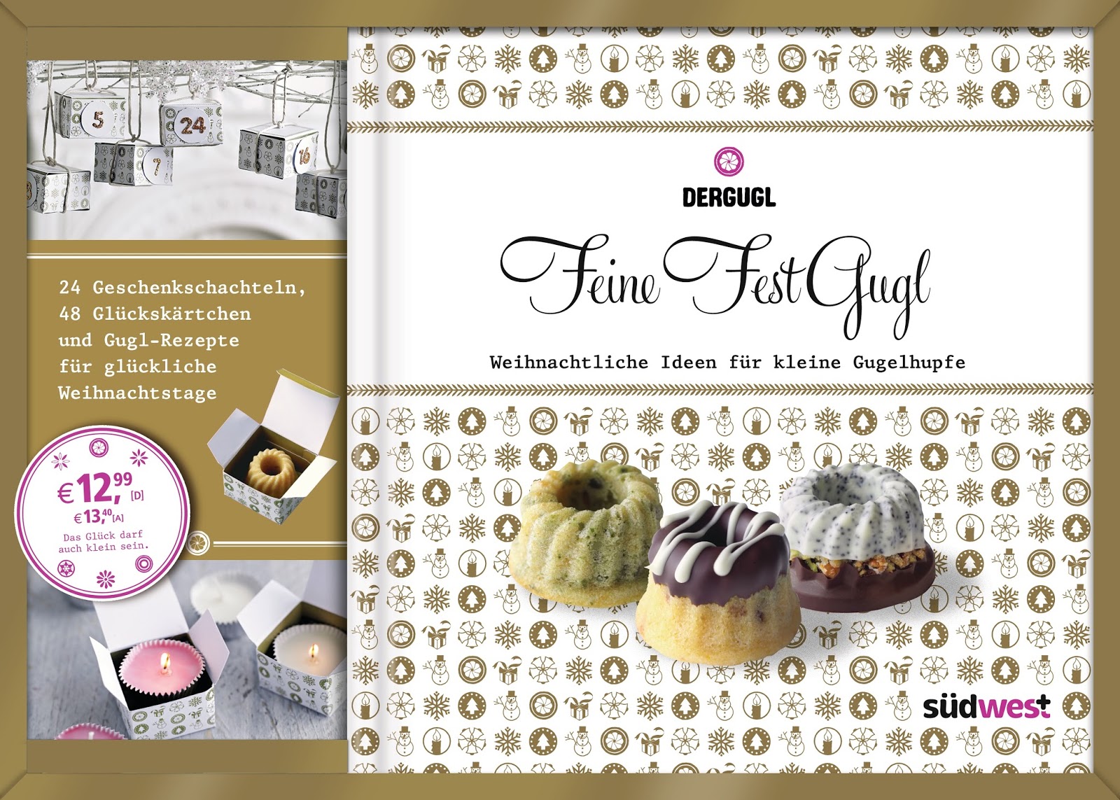 Wer kennt sie nicht die kleinn Gugelhupfe die mit einem Schwups im Mund sind? Chalwa Heigl brachte Der Gugl gross hinaus mit den Büchern Feine Gugl, Feine SchokoGugl und Feine Party-Gugl, nun durften wir über ihren vierten Streich freuen. Feine FestGugl erscheinte bereits im Oktober im Südwest-Verlag und stimmte in die Vorweihnachtszeit ein. Normalerweise ist es im Set erhältlich mit einer Gugl-Silikon-Backform, dieses Mal kommt es mit einem Adventskalender daher.