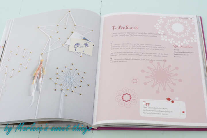 Das Buch ist sehr Abwechslungsreich von Papiersternen falten, über Teetassen verschönern bis zum Weihnachtswald aus sägen, findet man noch so einiges anderes um sein zu Hause zu verschönern.