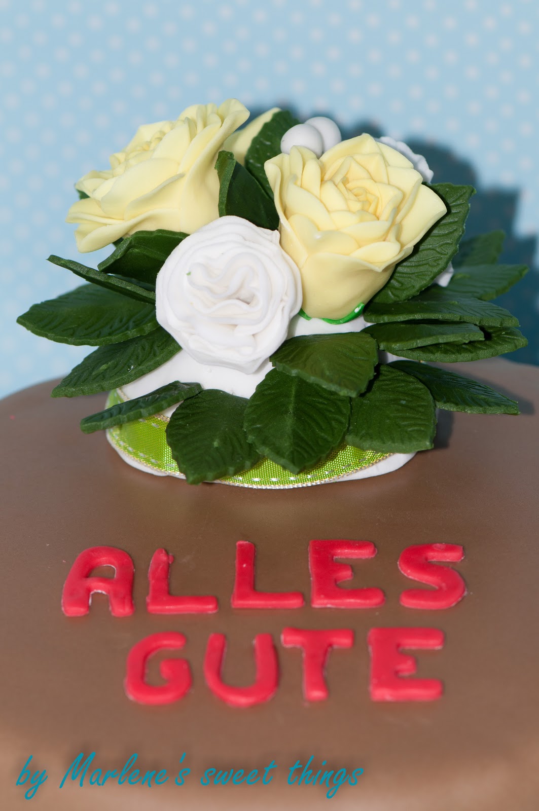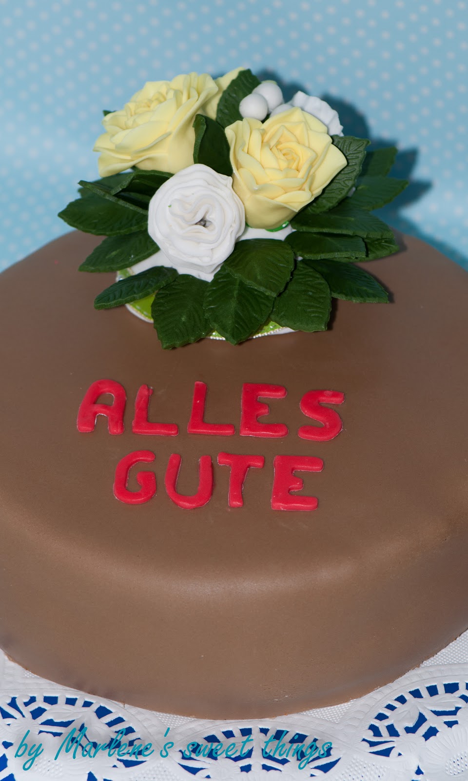 Die Buchstaben hab ich auch, glaub ich 🙂 Schön geworden, deine Torte. Schöne Rosen und ein perfekt glatter Fondant 🙂