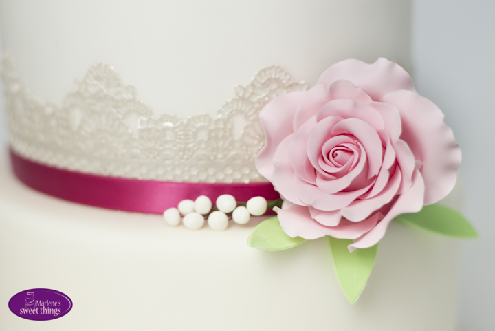 Schlichte Hochzeitstorte mit Rosen und Spitze