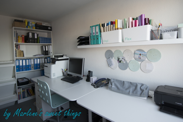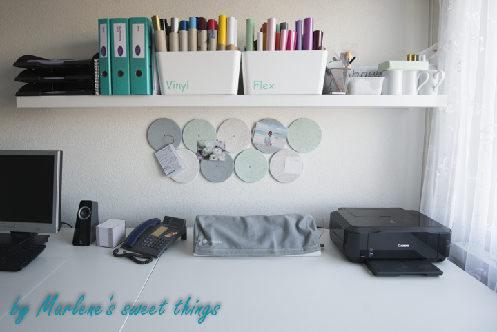 Dank meinem Plotter wurde so einiges übersichtlich angeschrieben, so dass jeder das Richtige findet. Trotzdem fehlte mir noch das gewisse Etwas im ganzen Zimmer. Schliesslich bin ich hier am Schreibtisch oft sehr kreativ und der „Marlene“ Touch fehlte mir. An der Wand zwischen Tisch und Wandregal war es mir zu leer, schnell kam mir die Idee eine Pinnwand selber zu gestalten, aber keine 0815 Rechteck mit Holzrahmen. Es brauchte was mit Farbe, ähm mit meiner Liebslingsfarbe..