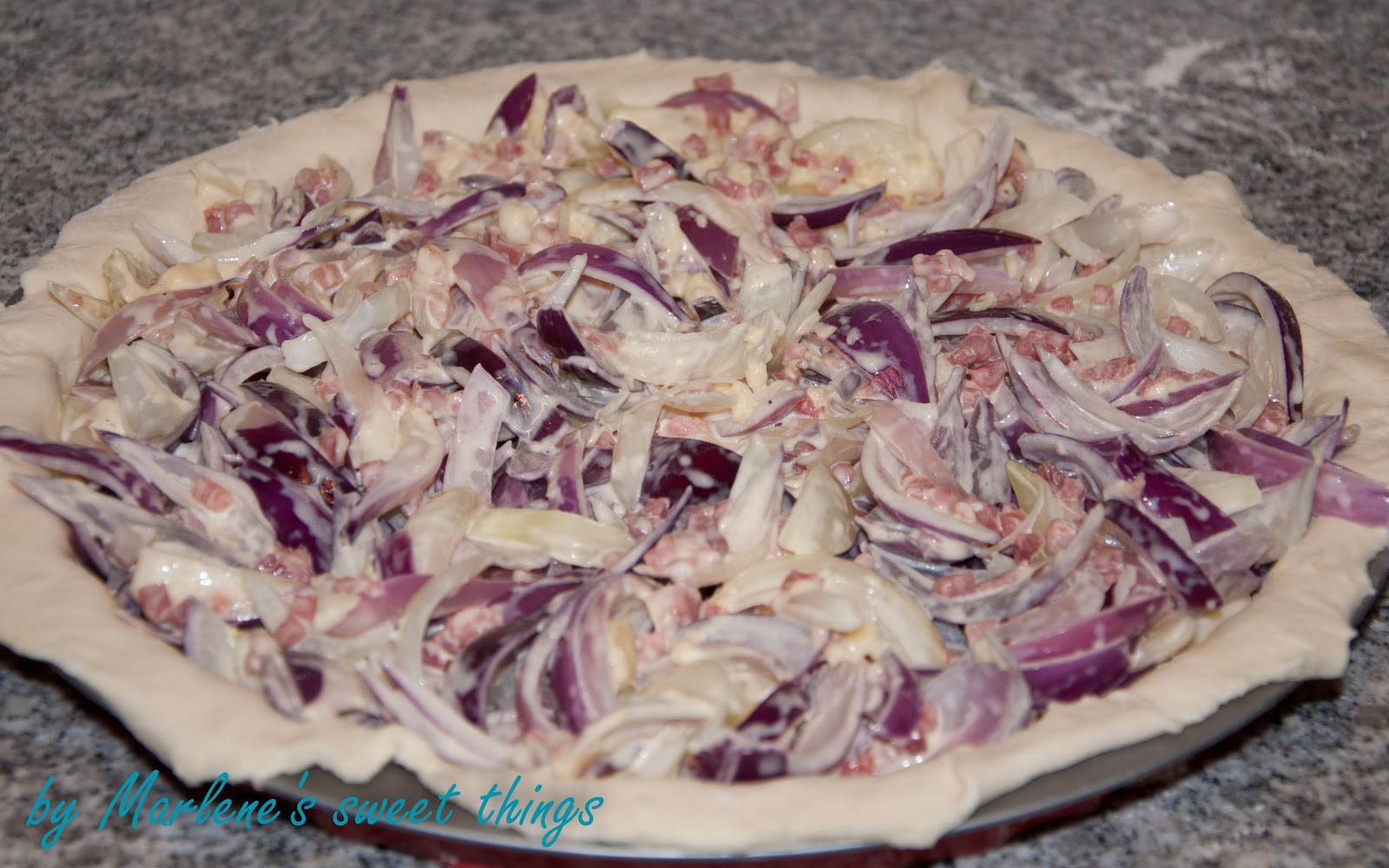 Die Masse über die Zwiebelmasse geben und sofort unterrühren.